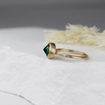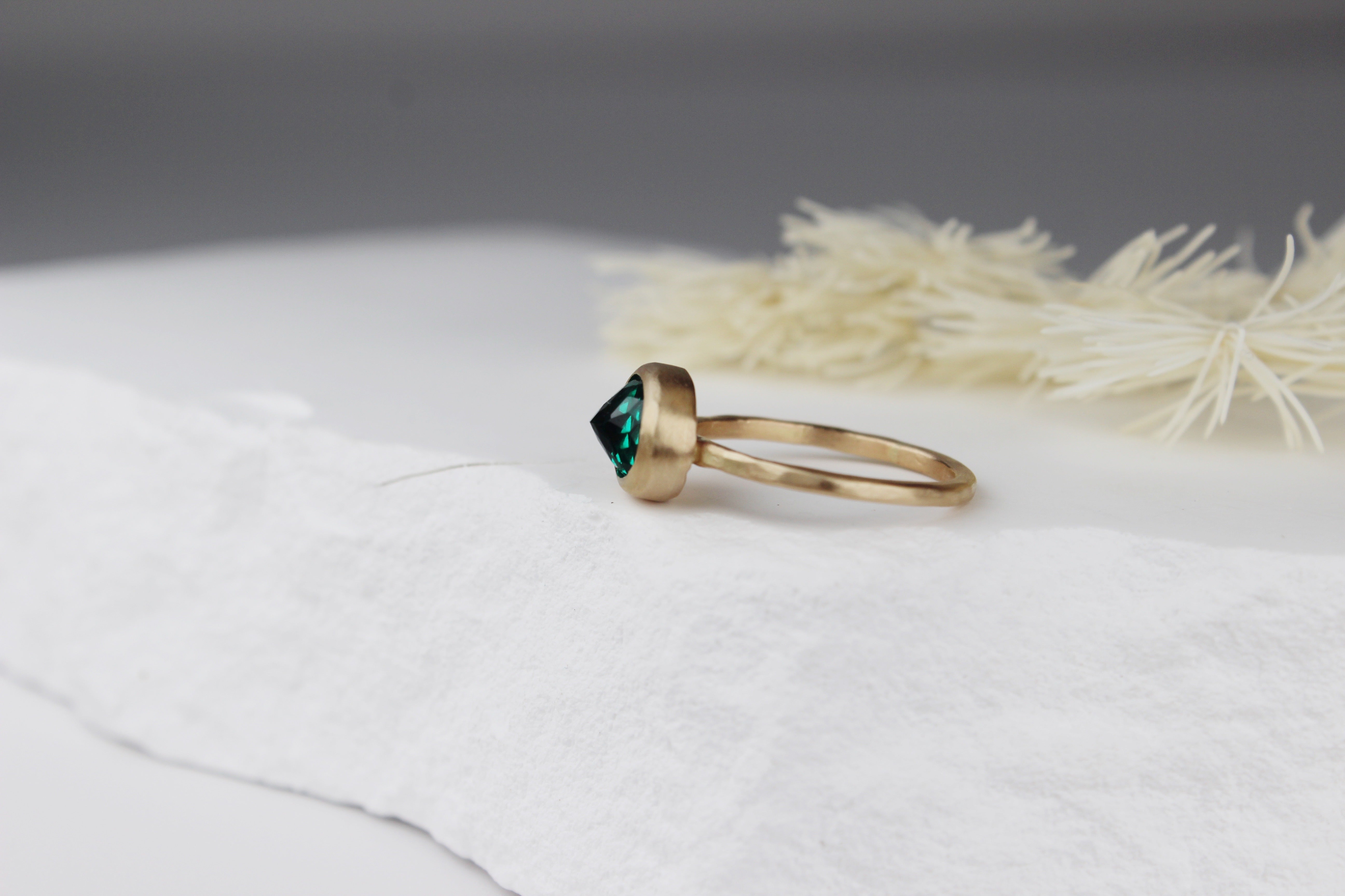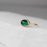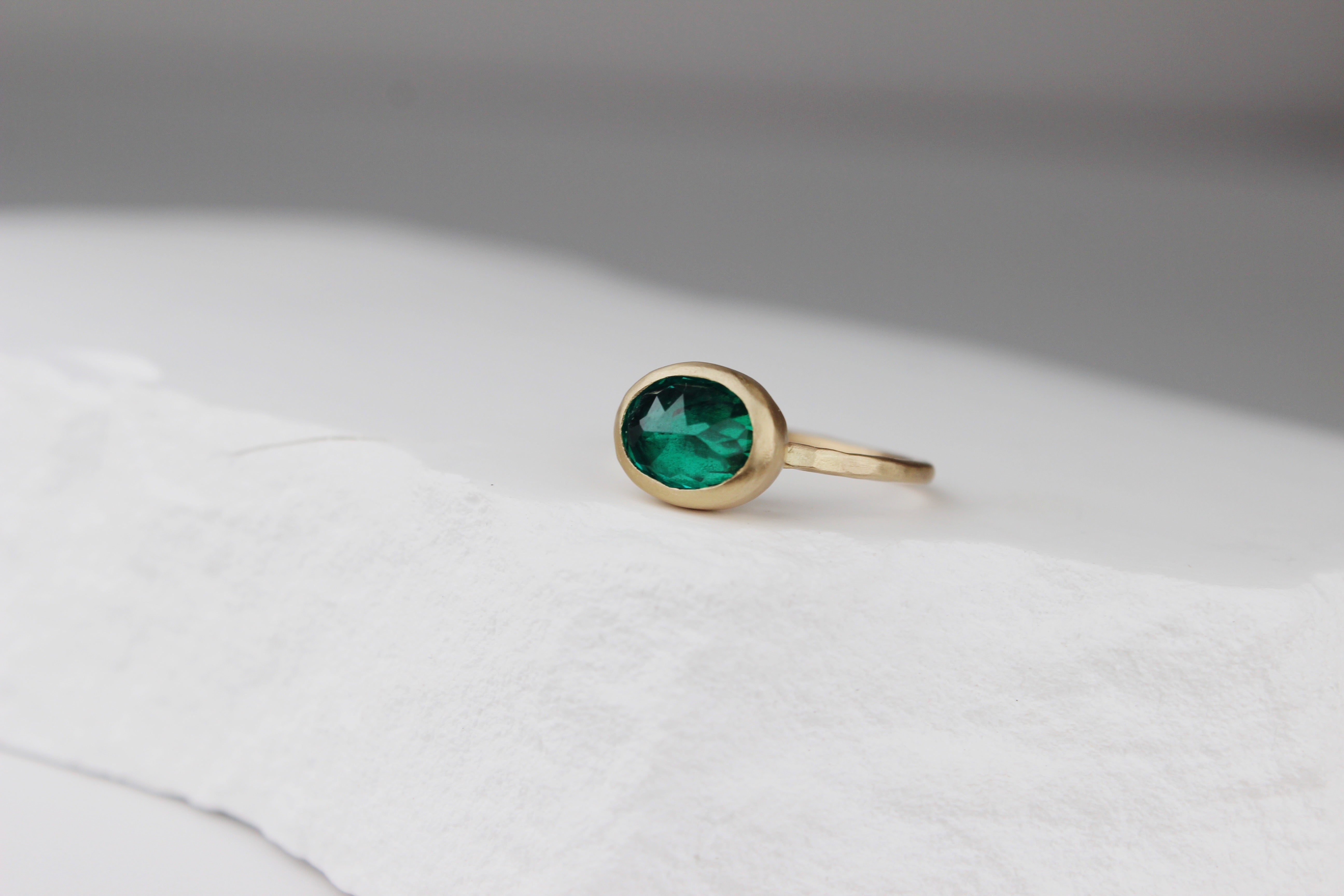 Oblong lab-grown emerald with 14k gold band, size 6.