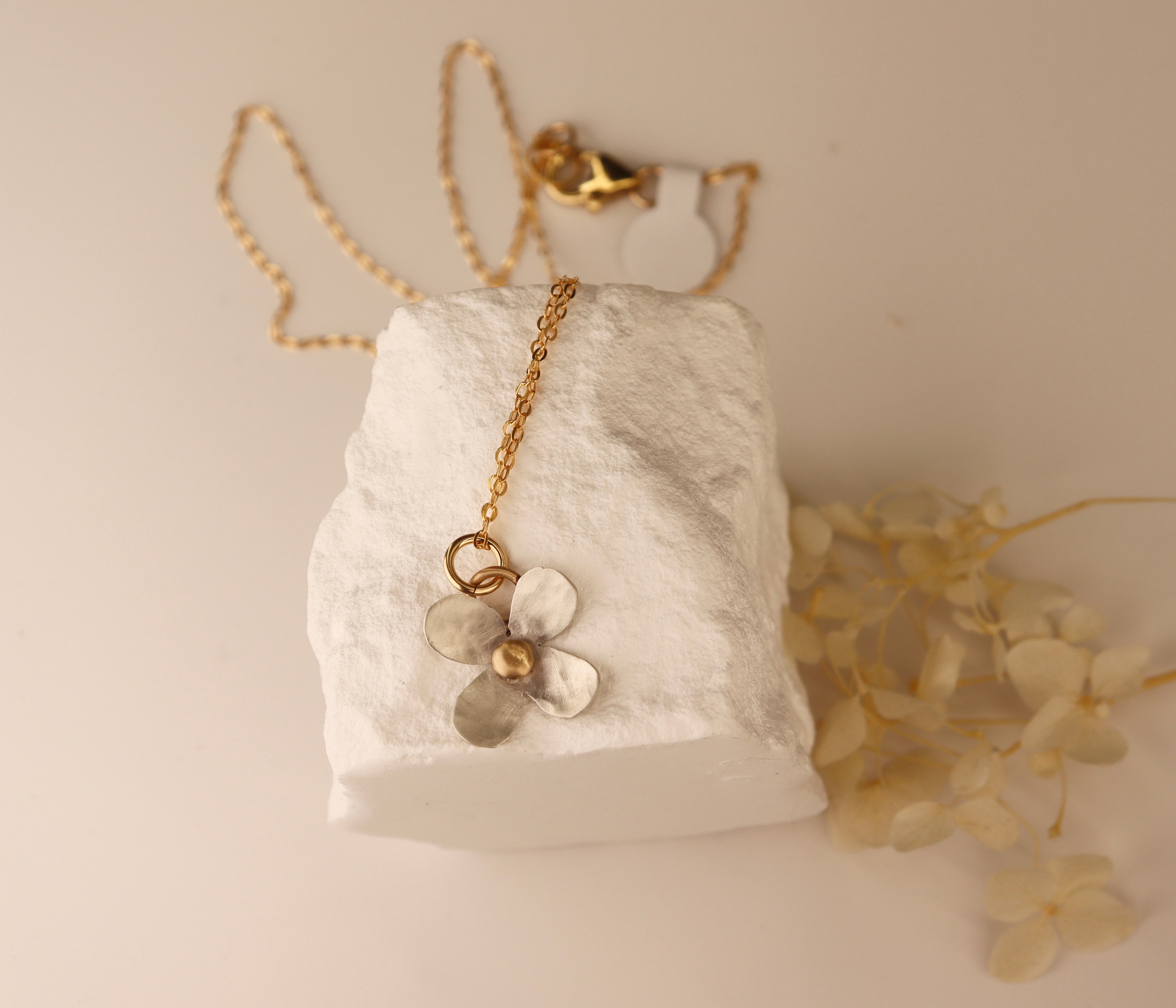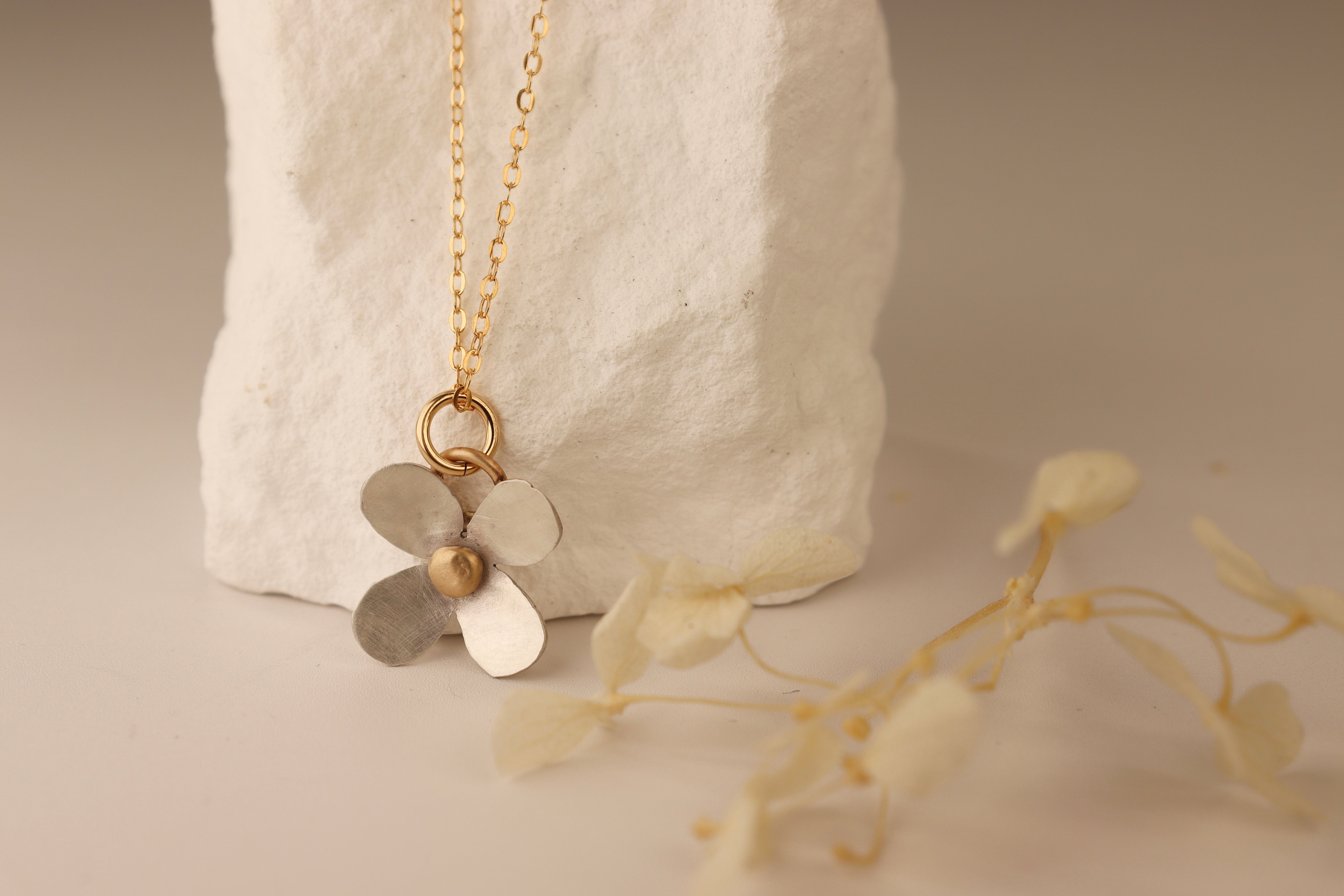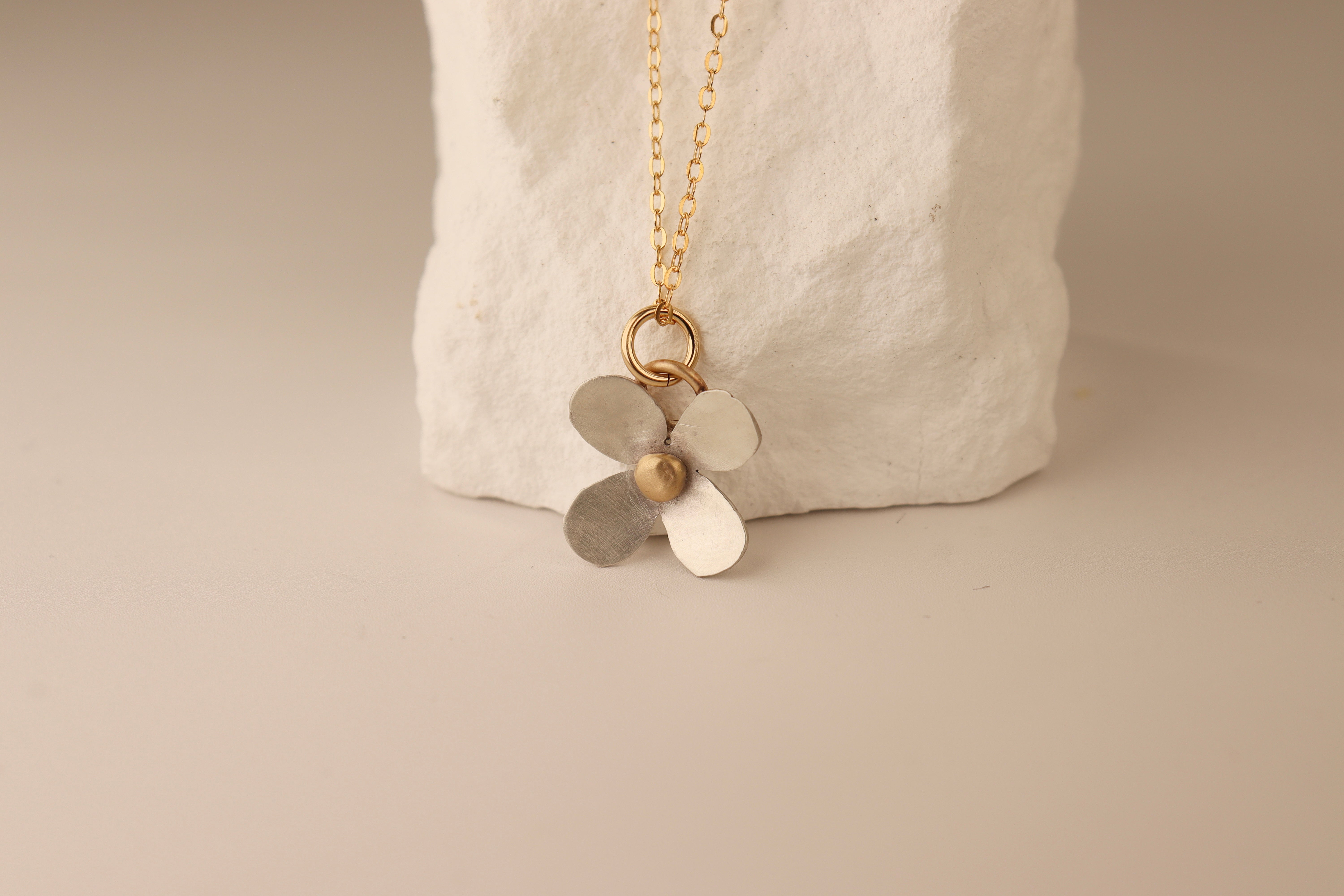 A sterling silver flower with 14k gold accents. 18” gold filled chain.