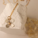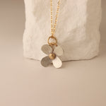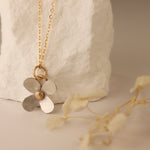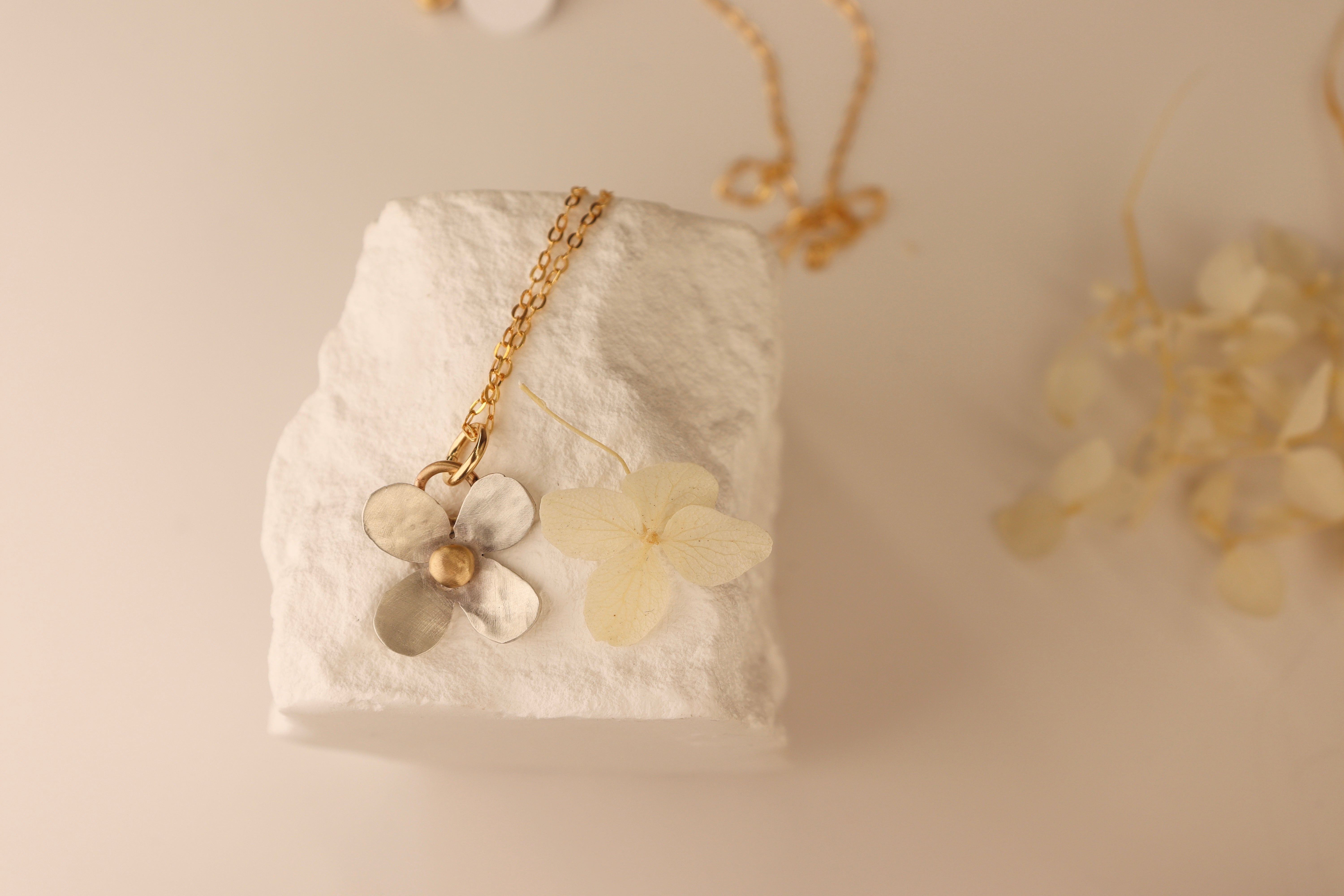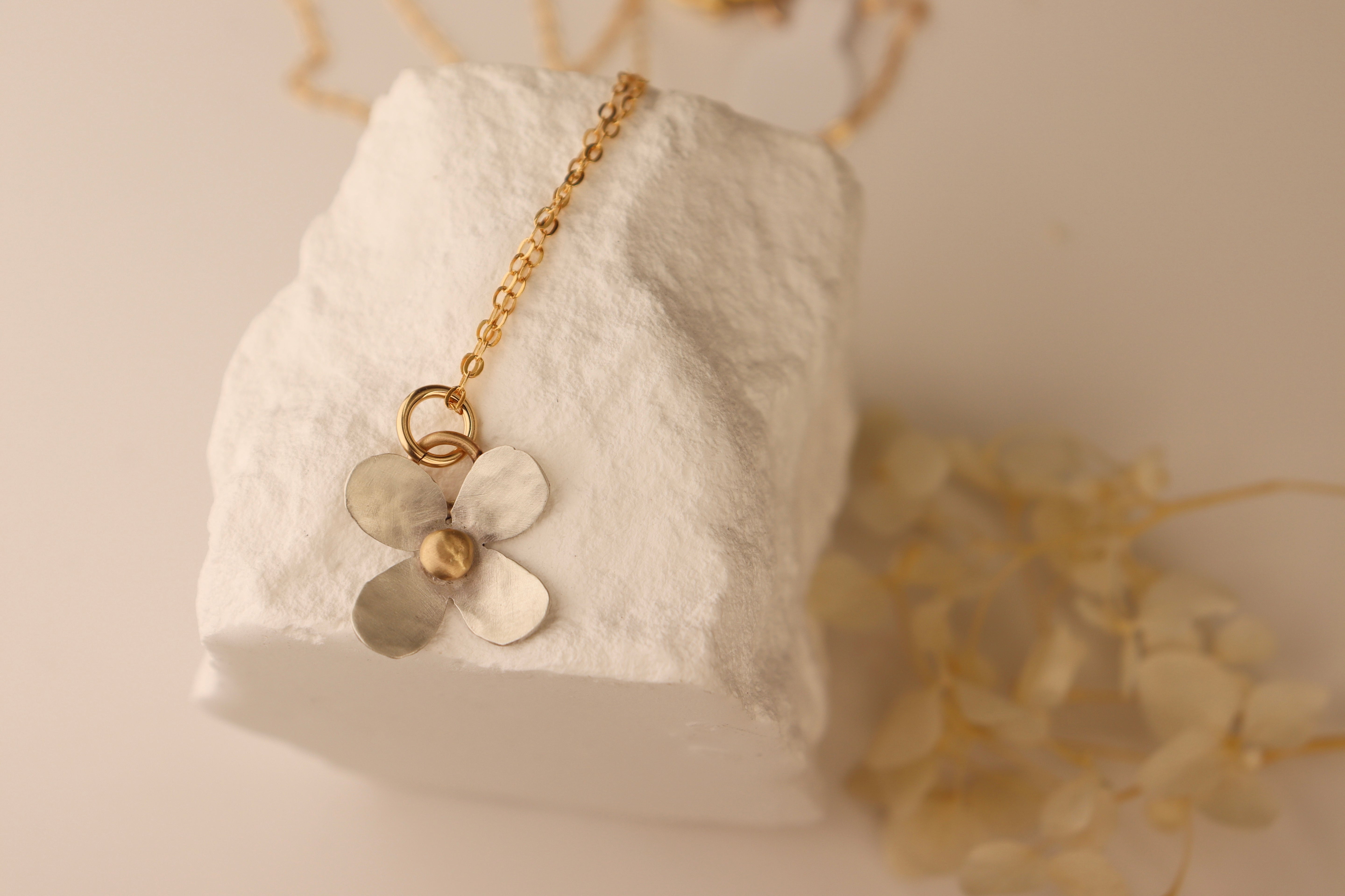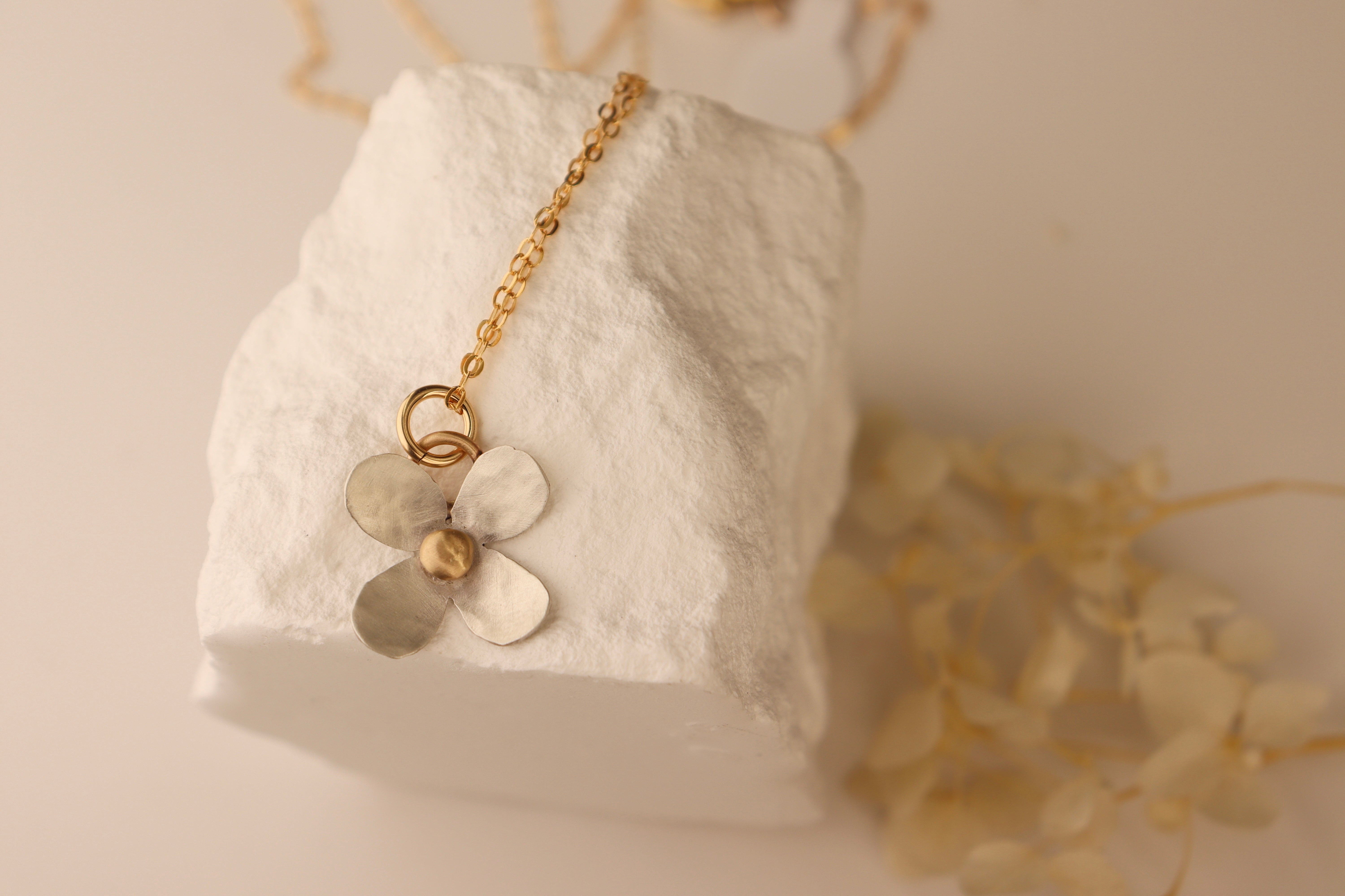 A sterling silver flower with 14k gold accents. 18” gold filled chain.