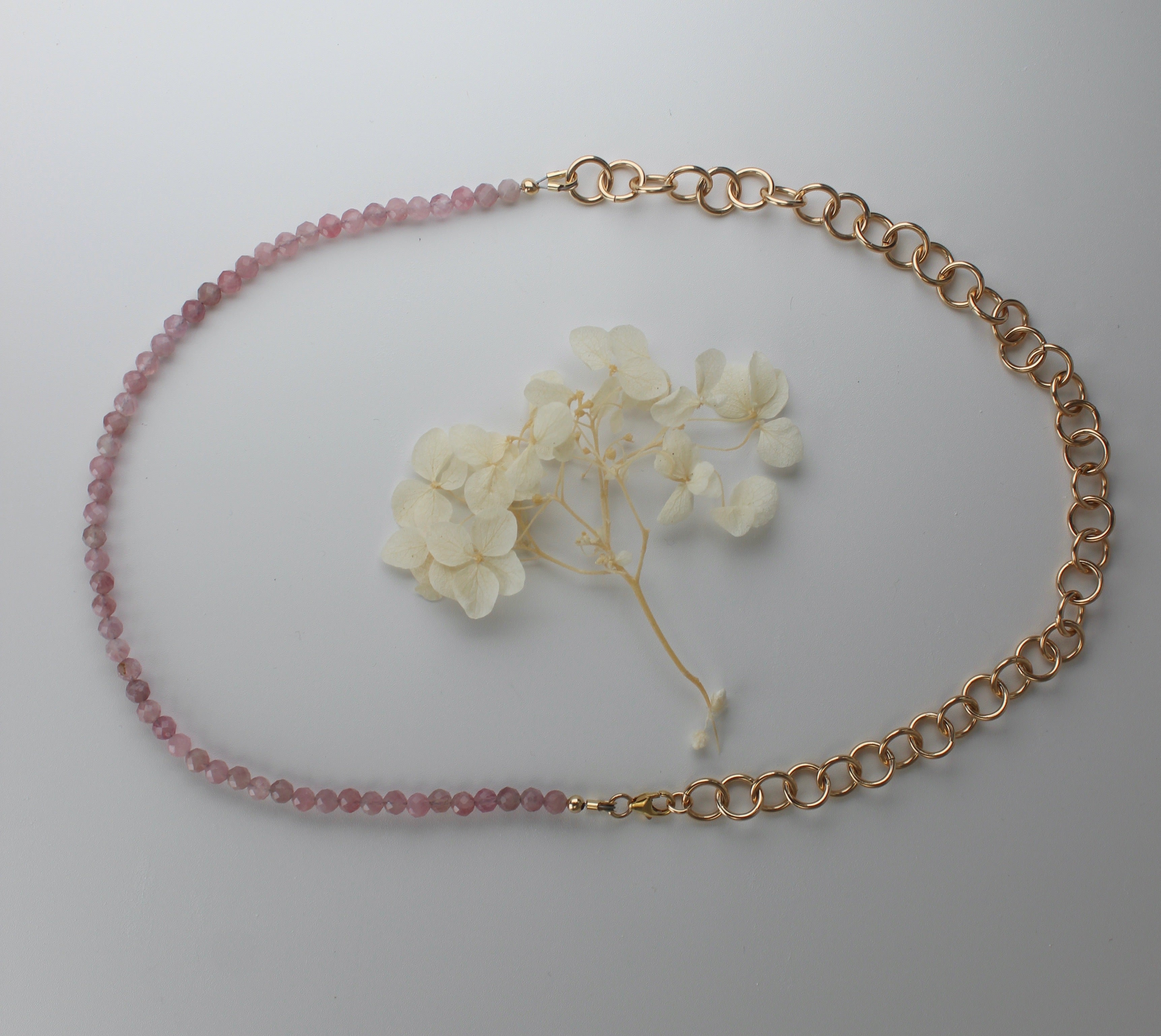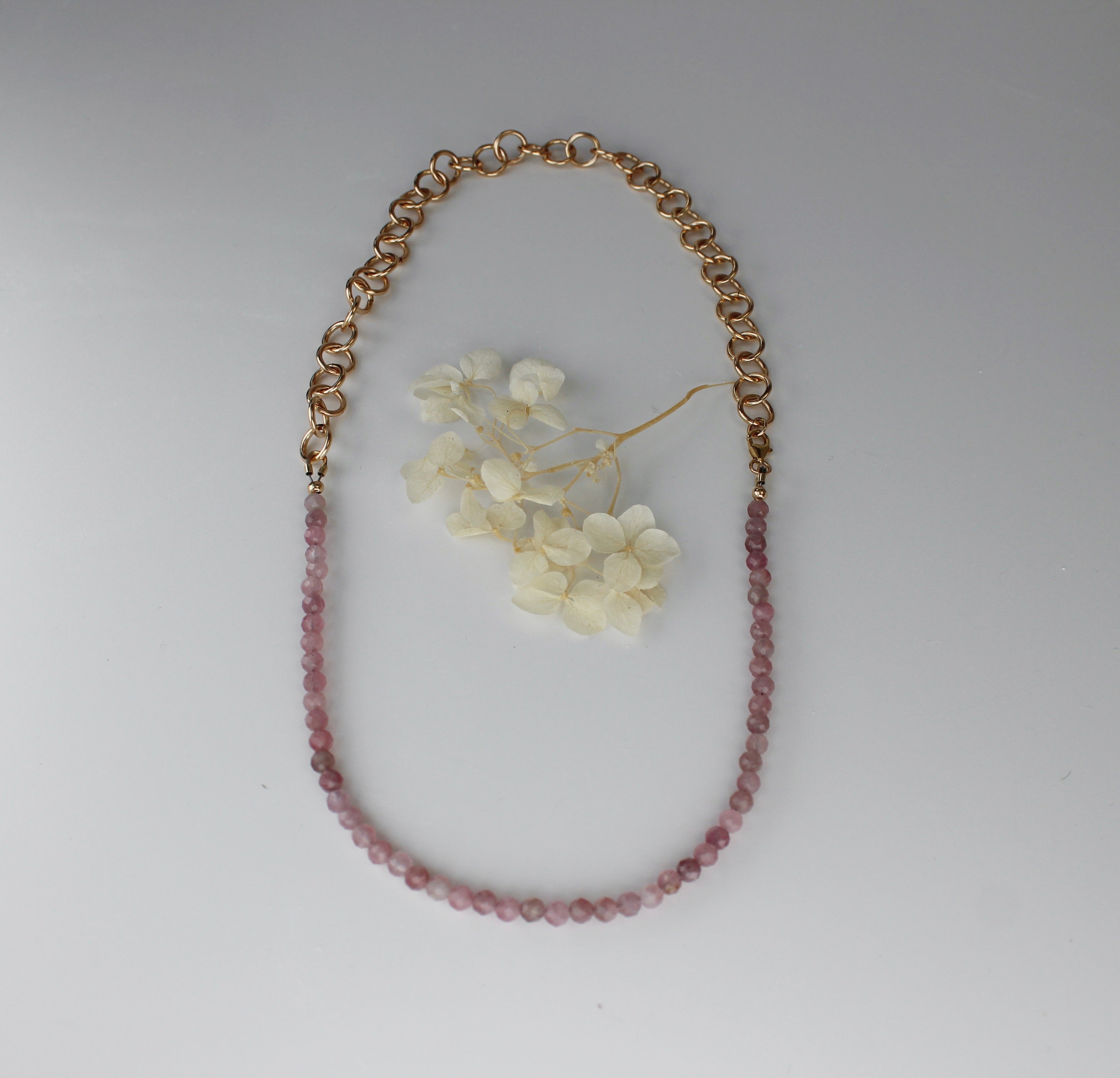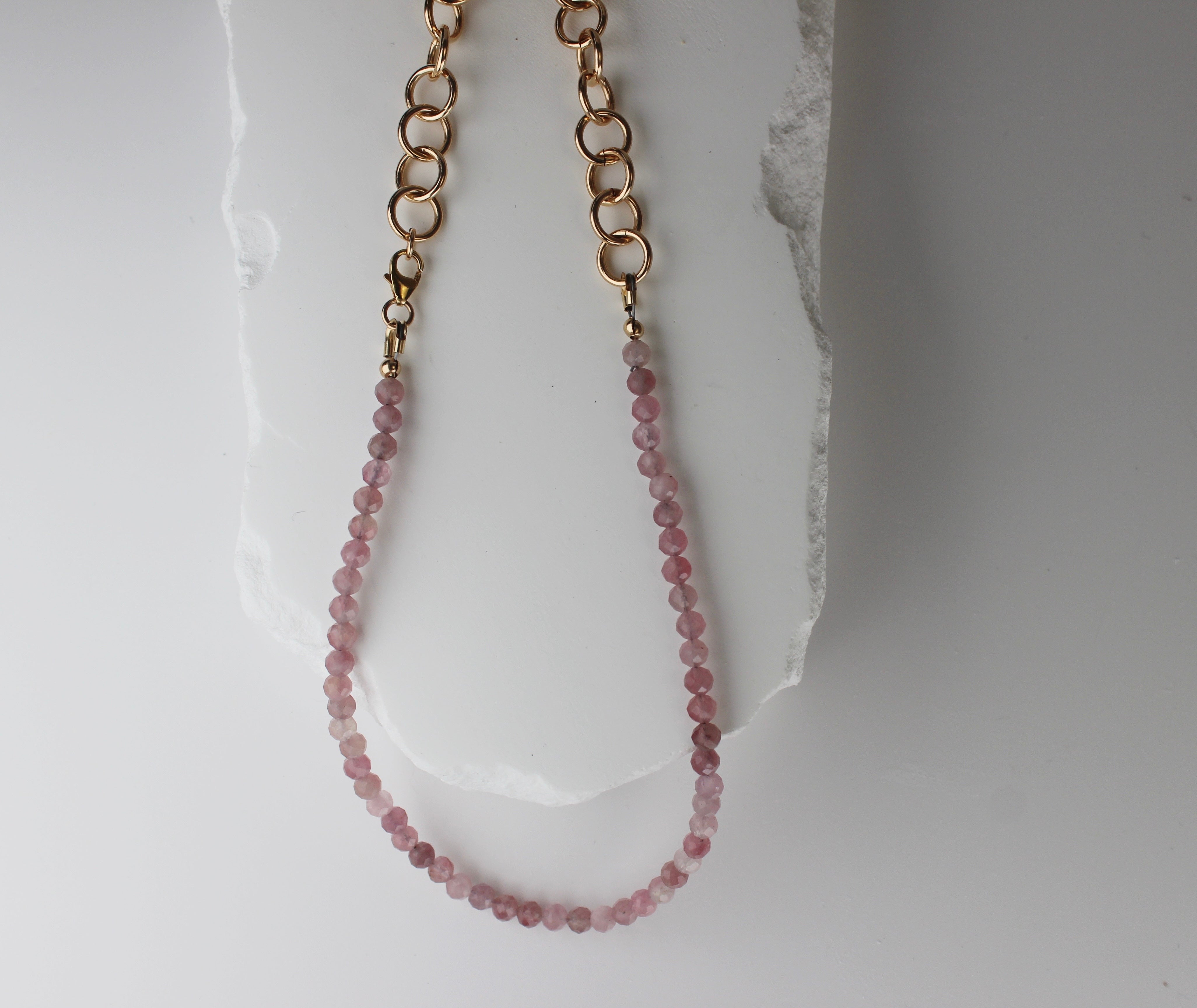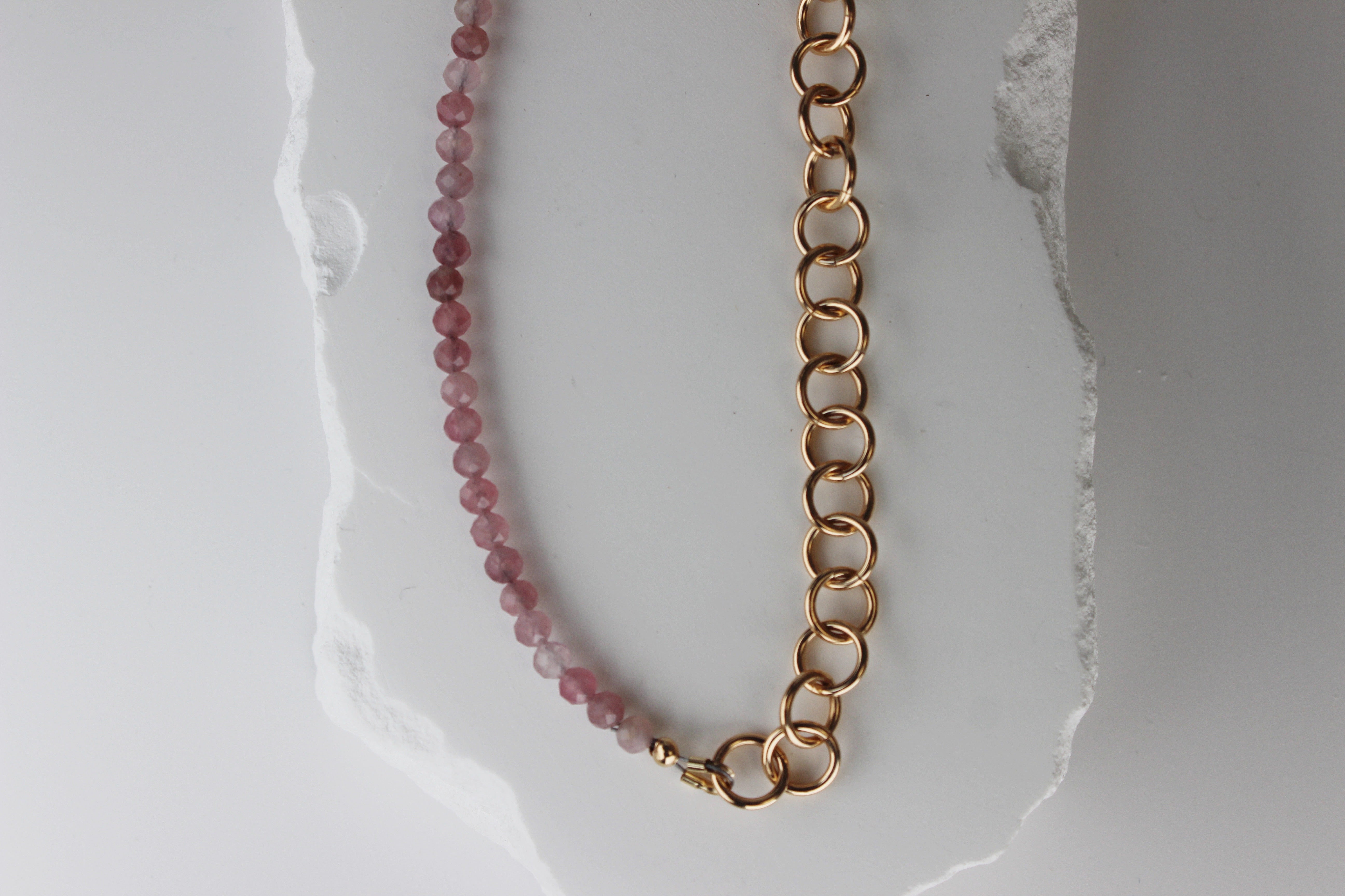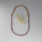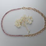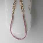 Rose quartz beaded necklace with gold fill chain, designed to be worn any way you please. 18" in length