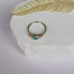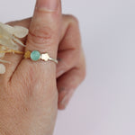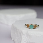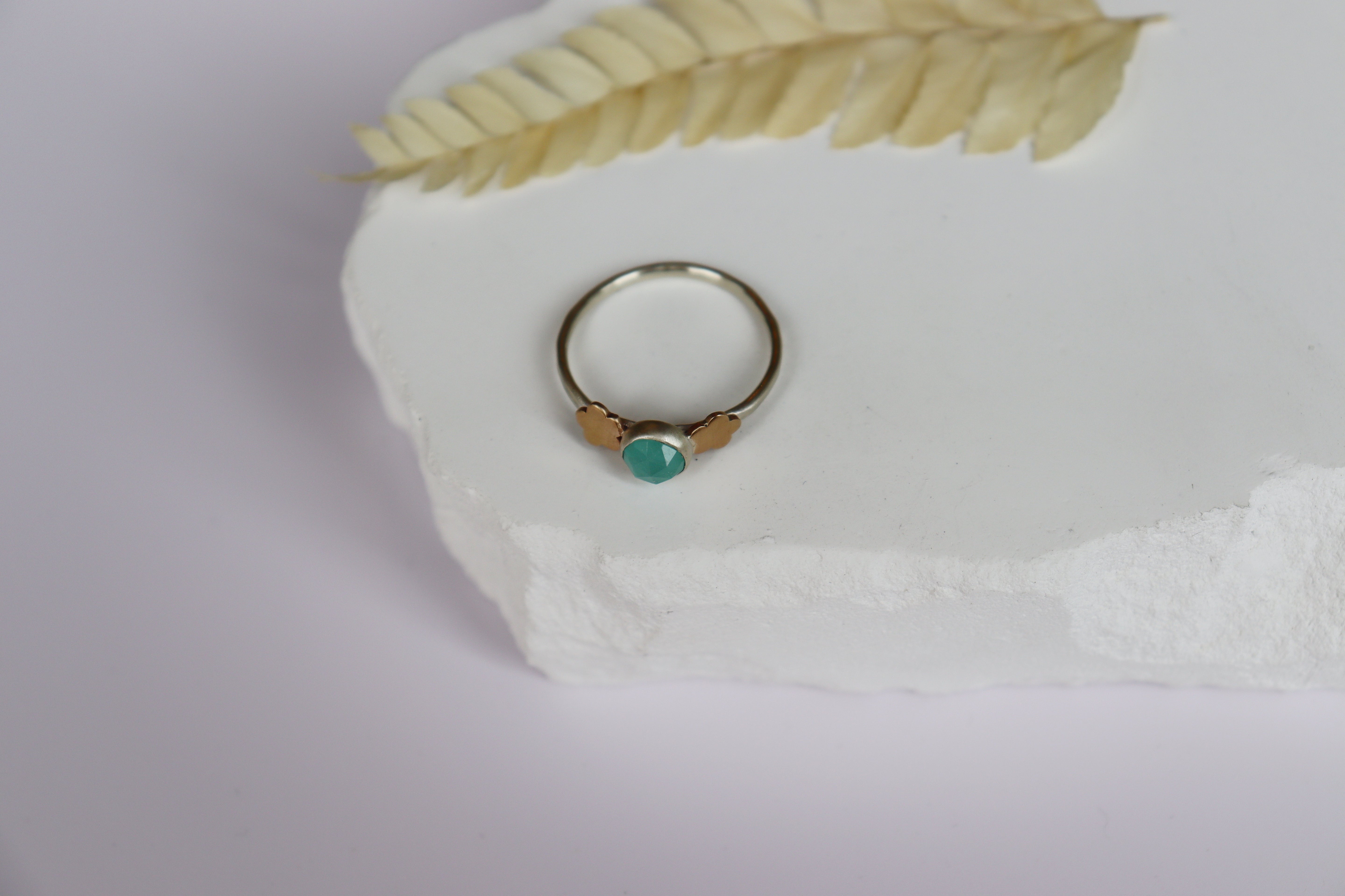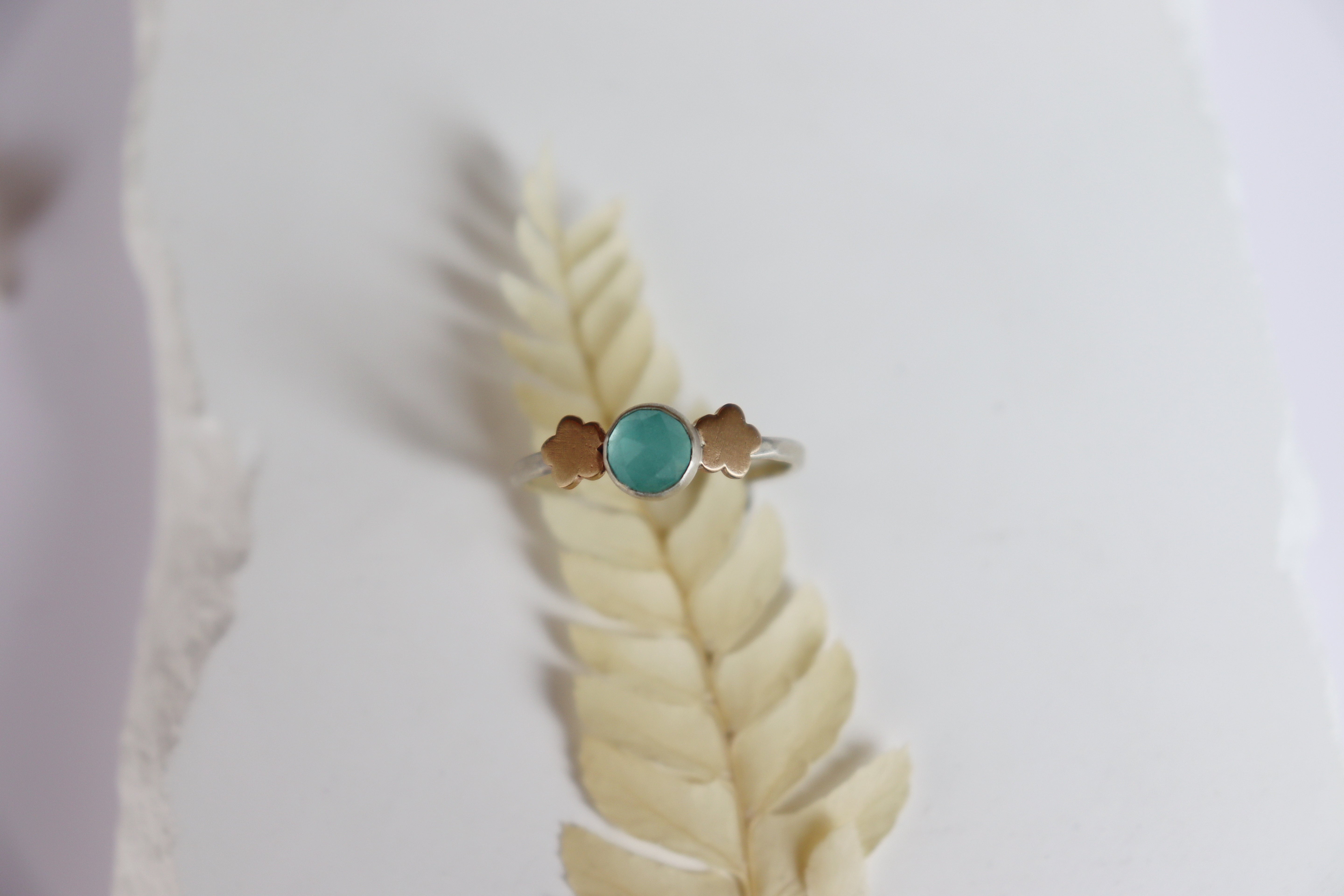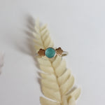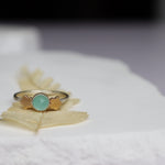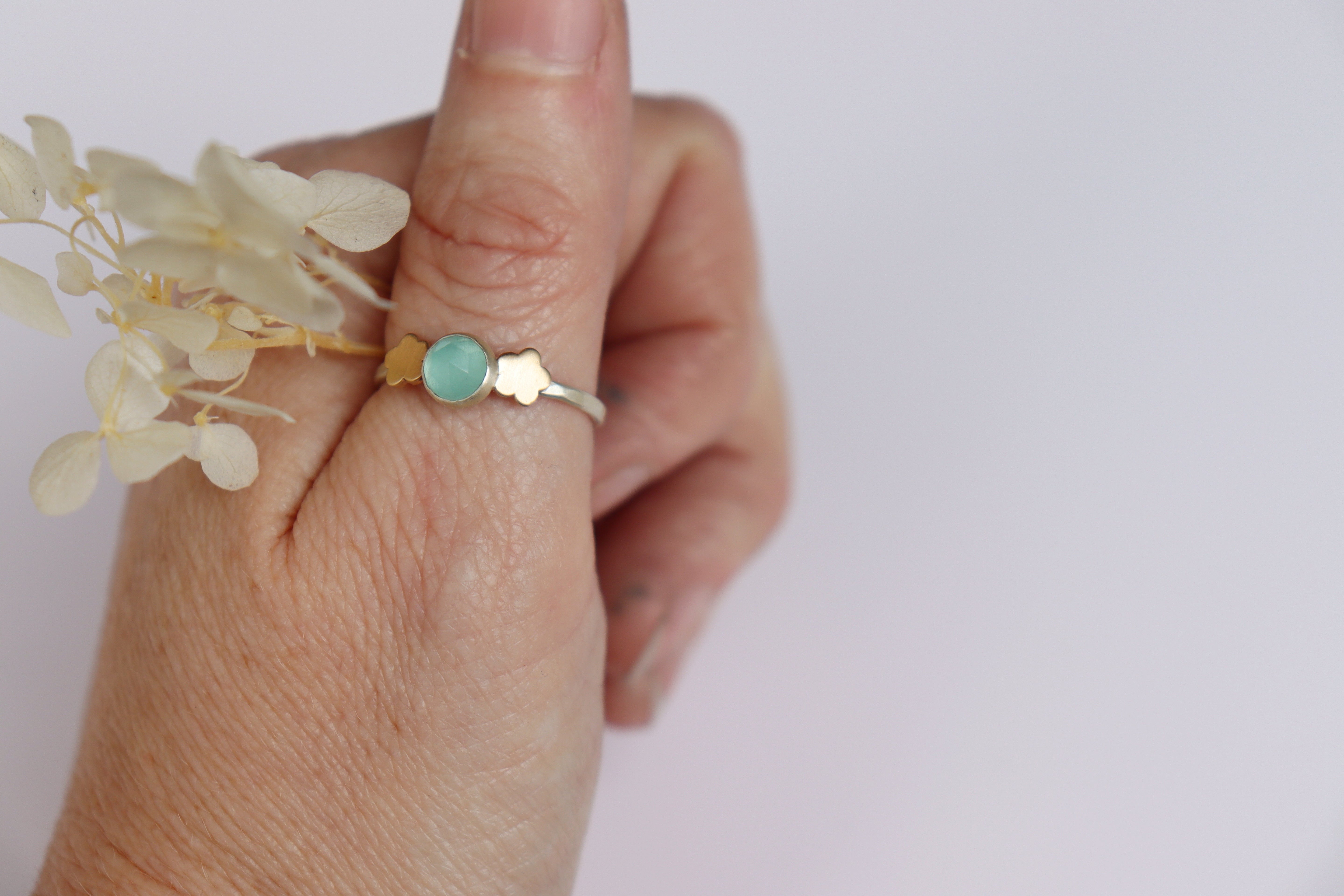 Aqua chalcedony flanked by flat gold flowers. Sterling silver band, size 8.