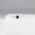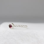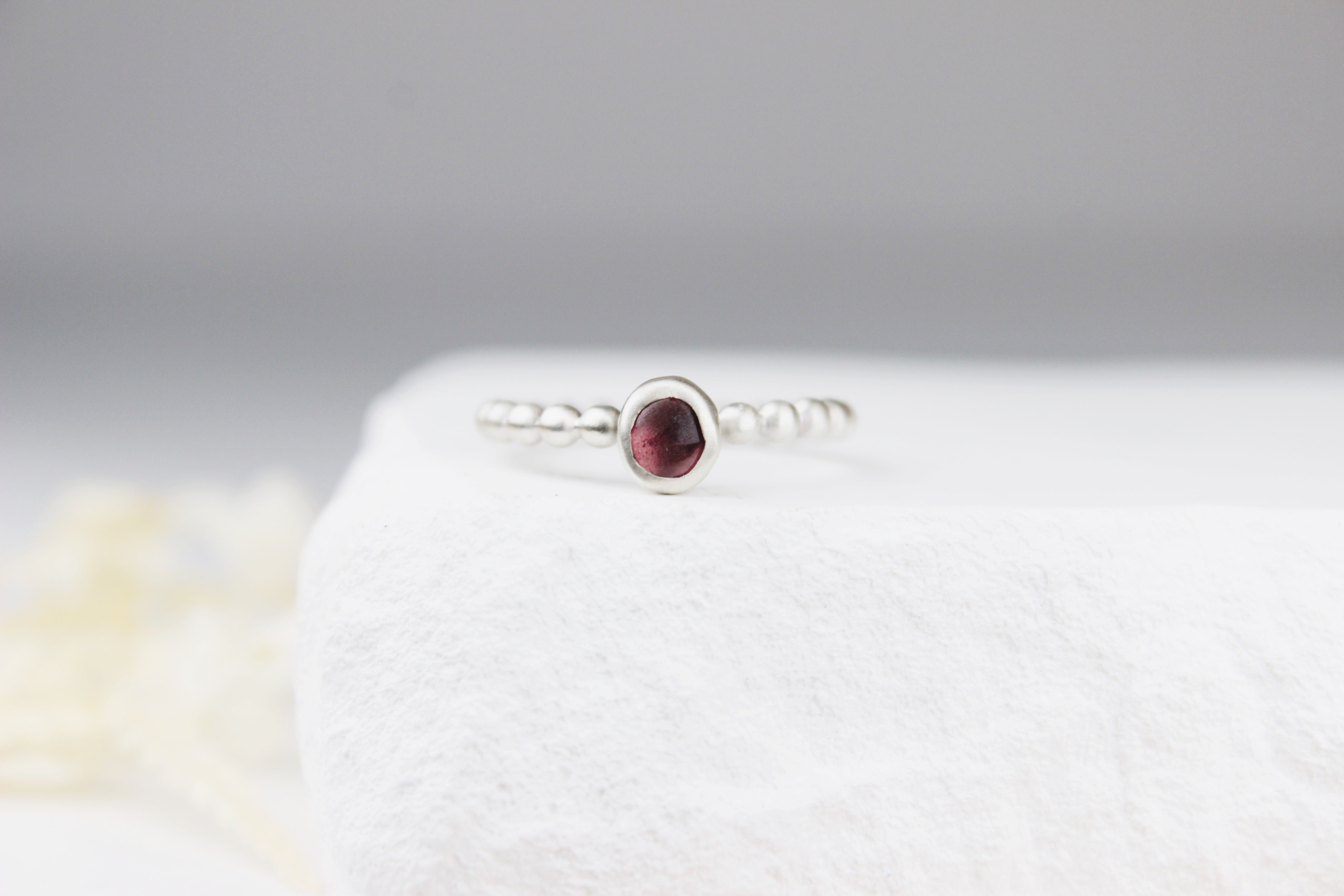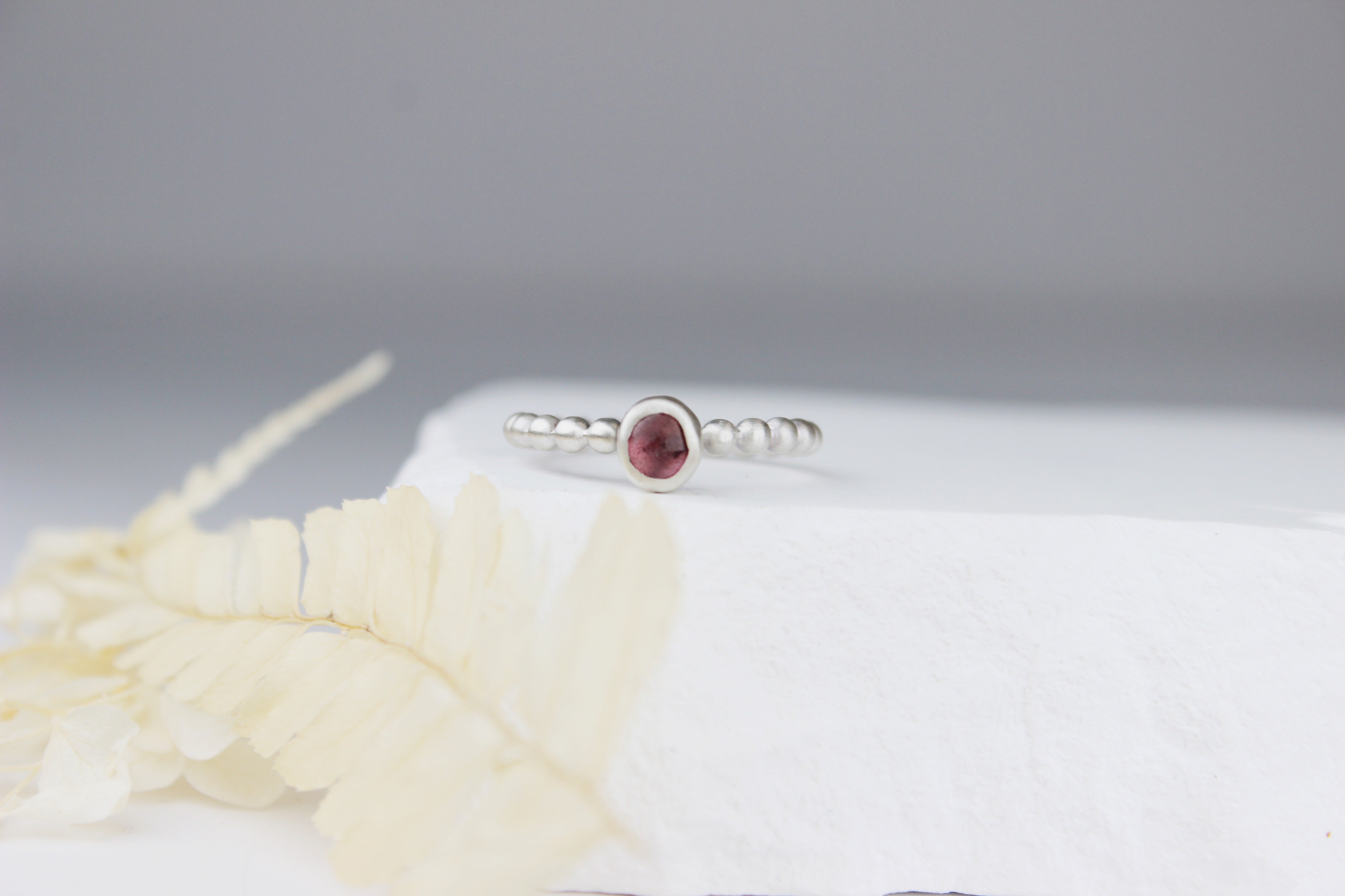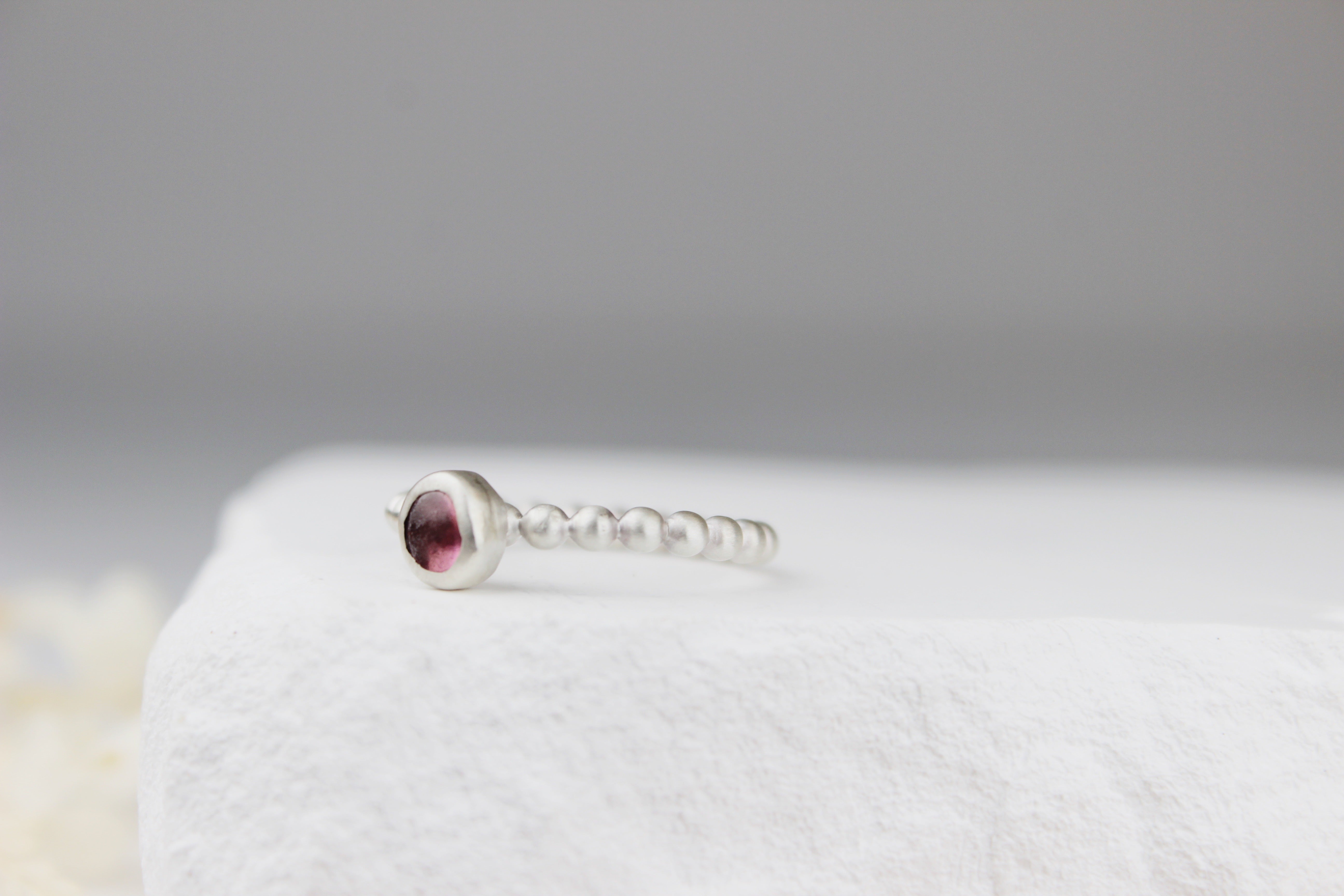 Sterling silver ring with dark pink tourmaline gemstone and unique band design in size 6.75.