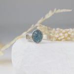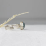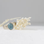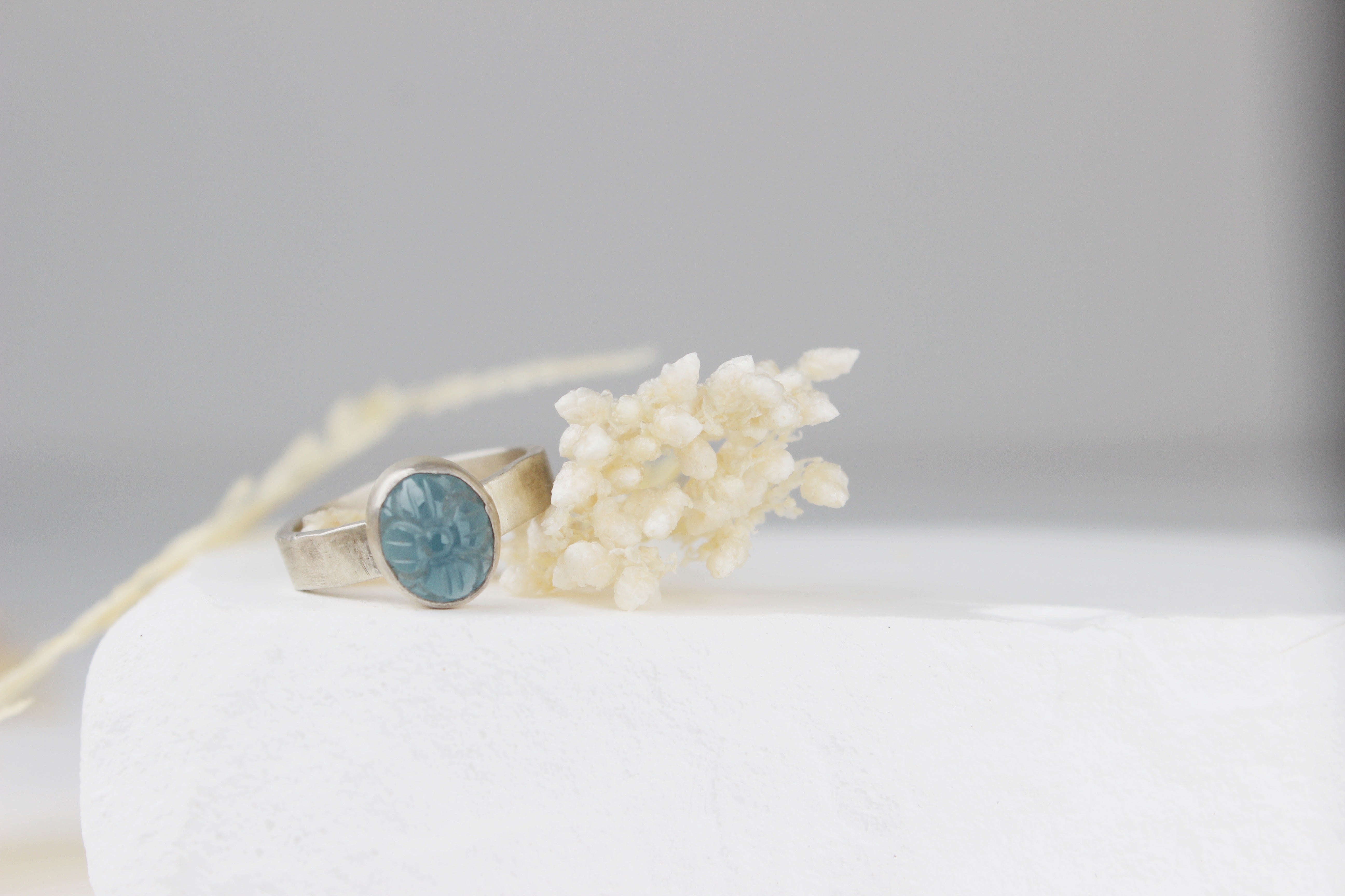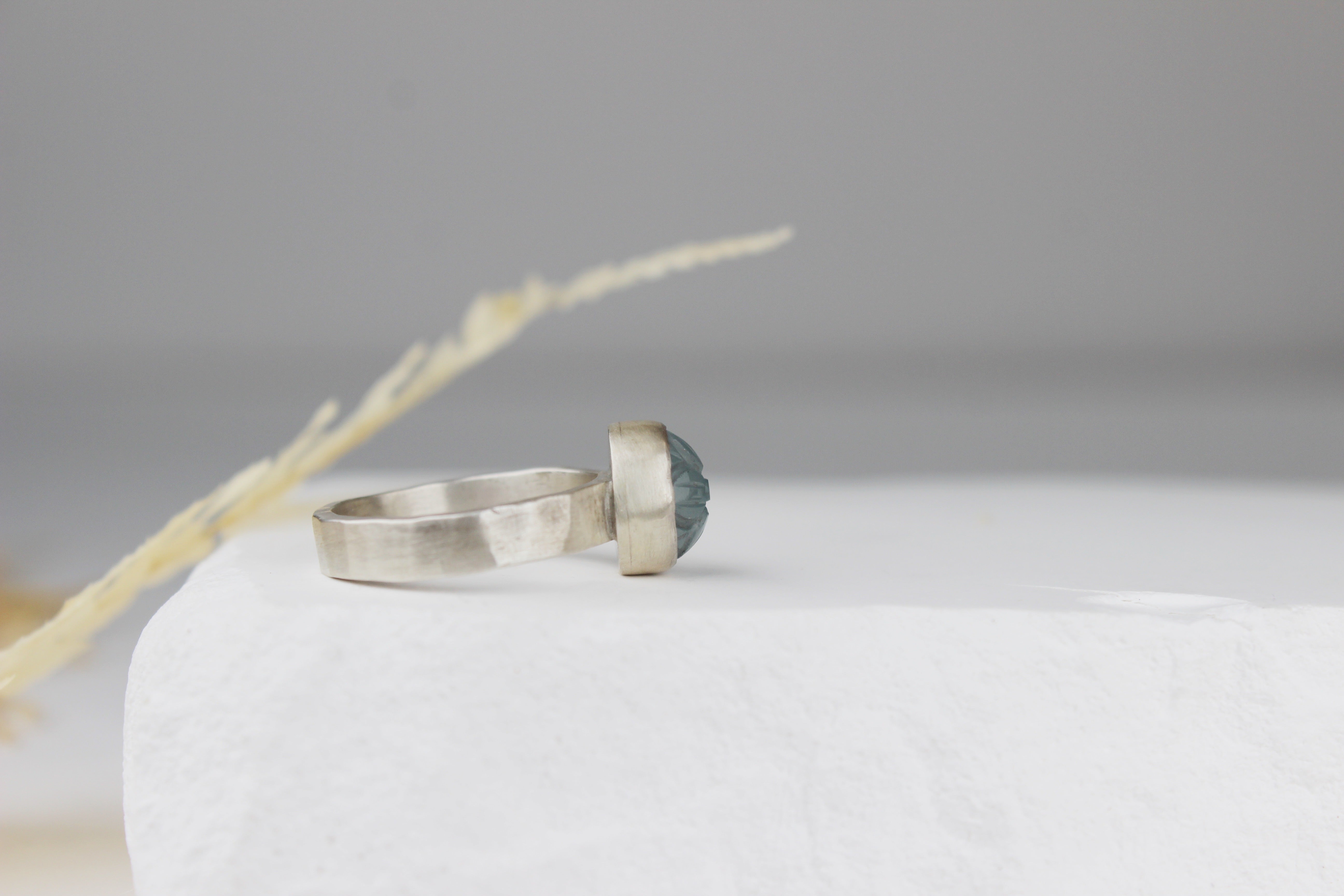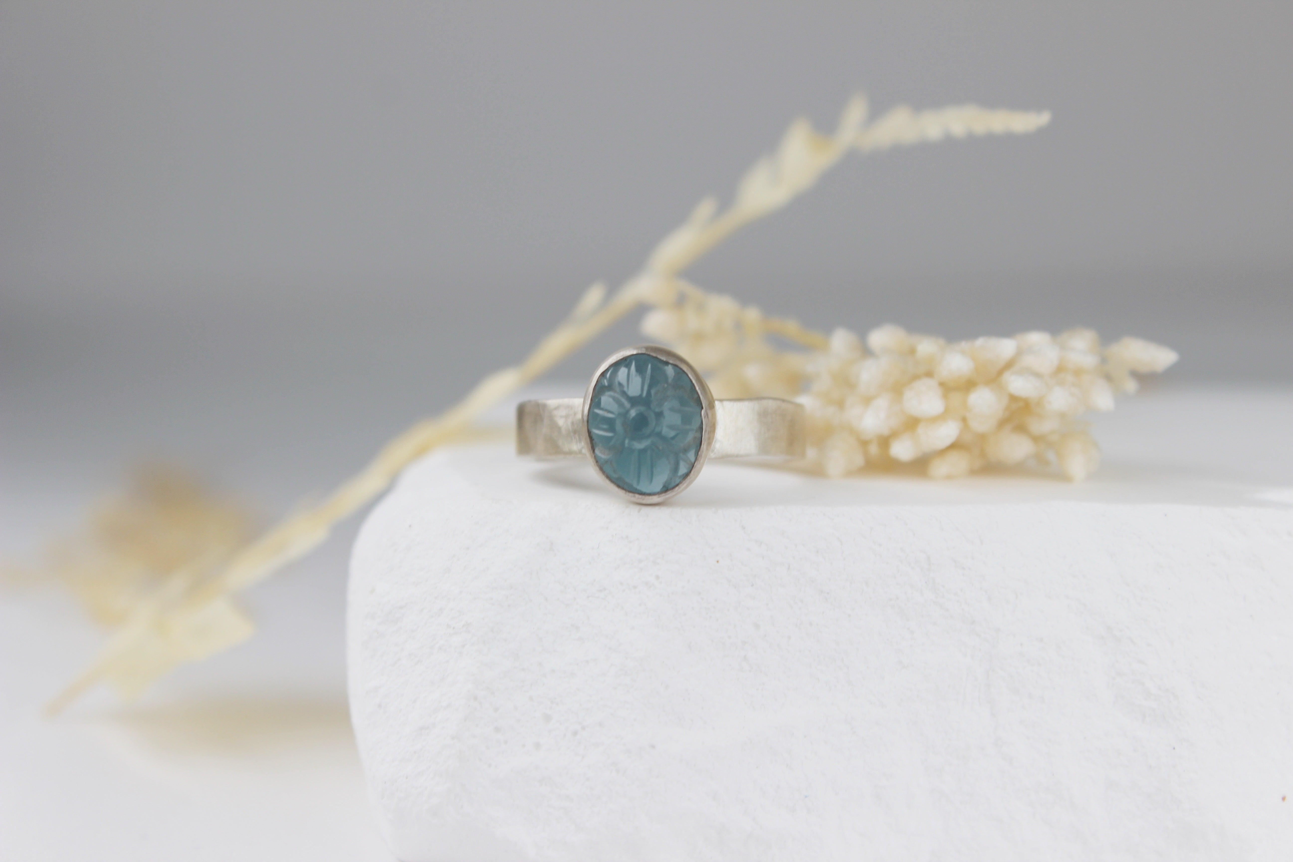 Aquamarine gemstone carved with floral design and a hammered silver band, size 7.5