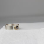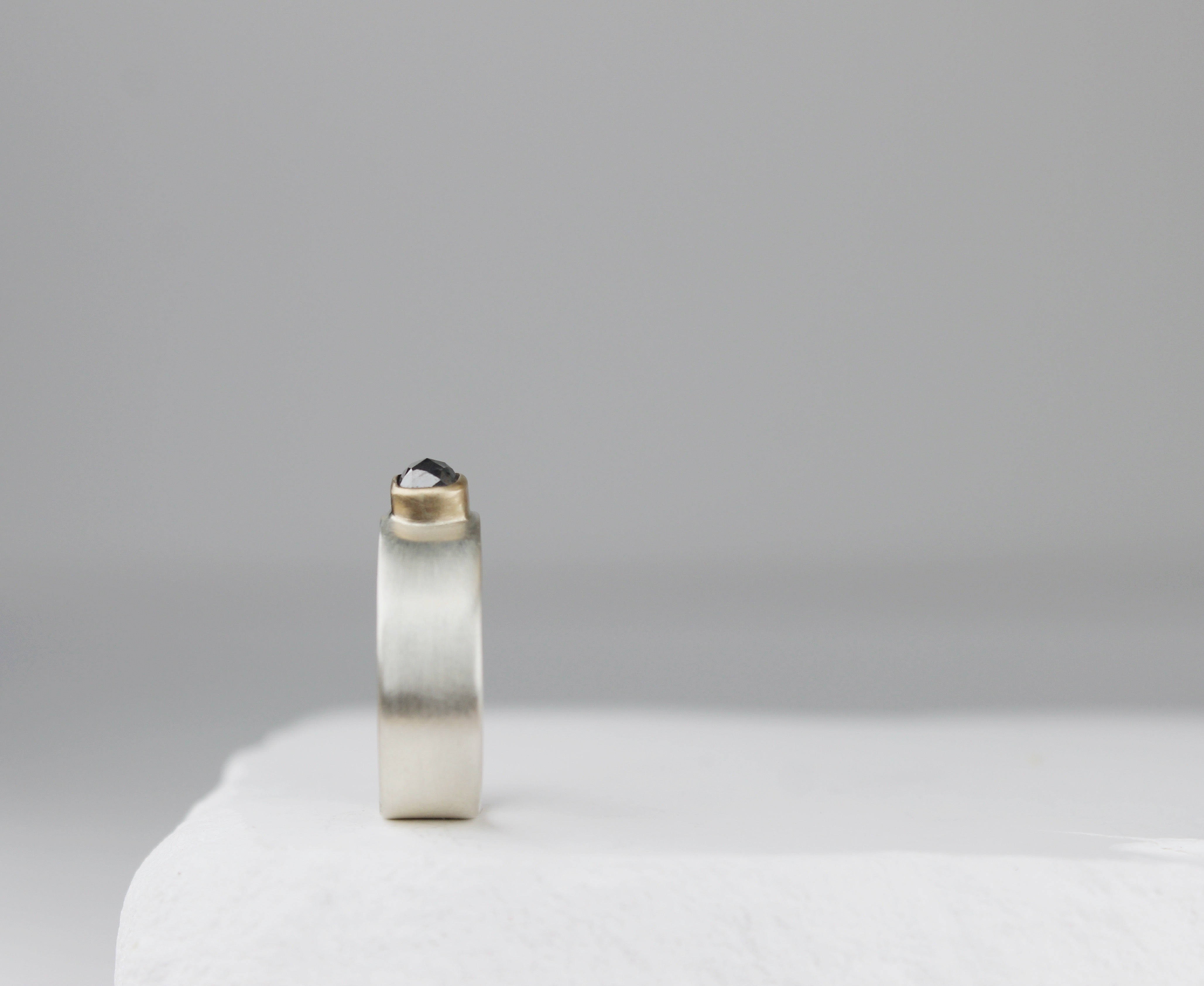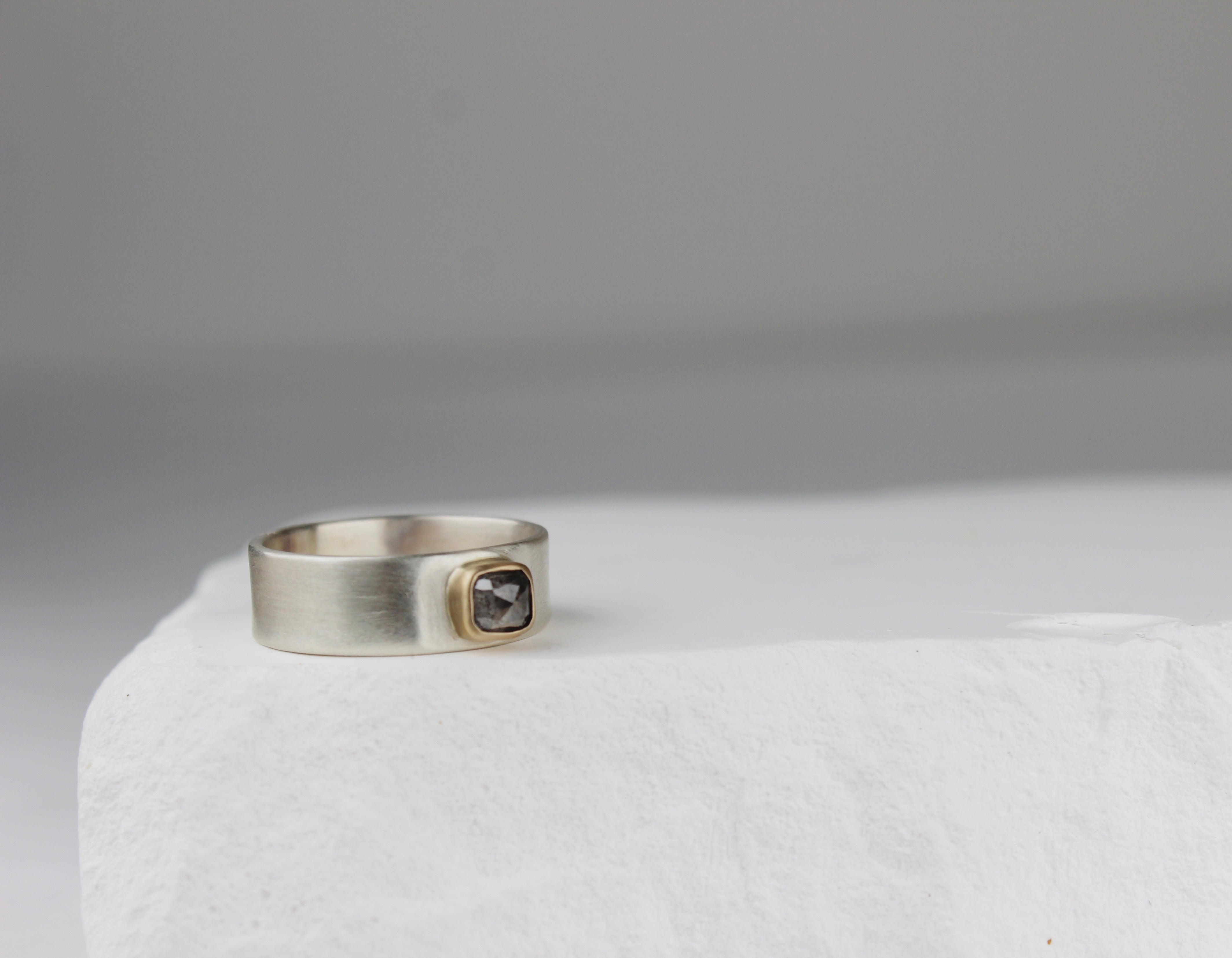 Gorgeous grey diamond set in 14k gold bezel with thick silver band, size 7.5.